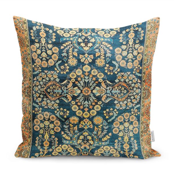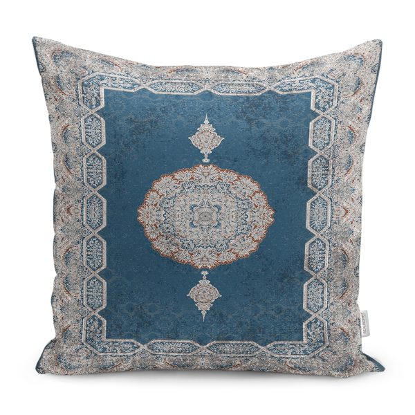 RealHomes Mavi Zeminde Dokuma Halı Motifli Eskitme Desenli Dijital Baskılı Yastık Kırlent Kılıfı