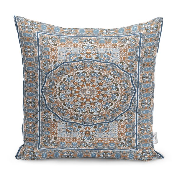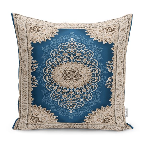 RealHomes Mavi Zeminde Göbekli Halı Motifli Etnik Desenli Dijital Baskılı Yastık Kırlent Kılıfı