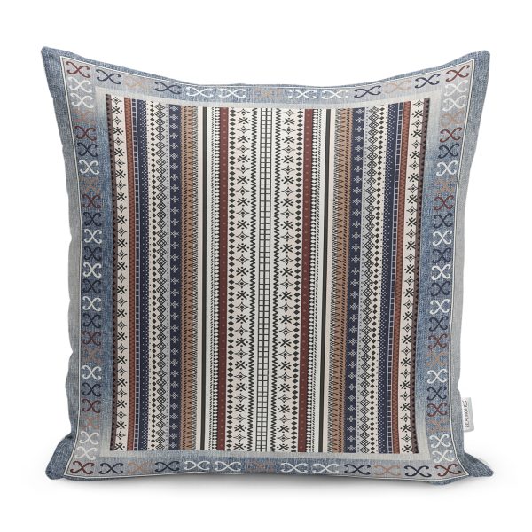 RealHomes Mavi Zeminde Etnik Motifli Örgü Desenli Dijital Baskılı Yastık Kırlent Kılıfı