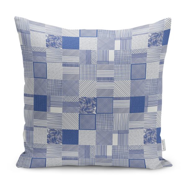 RealHomes Mavi Zeminde Geometrik Motifli Patchwork Desenli Dijital Baskılı Yastık Kırlent Kılıfı