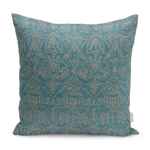 RealHomes Mavi Zeminde Antika Motifli Eskitme Desenli Dijital Baskılı Yastık Kırlent Kılıfı