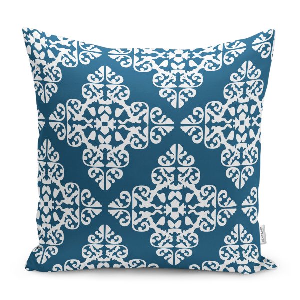 RealHomes Mavi Zeminde Etnik Motifli Damask Desenli Dijital Baskılı Yastık Kırlent Kılıfı