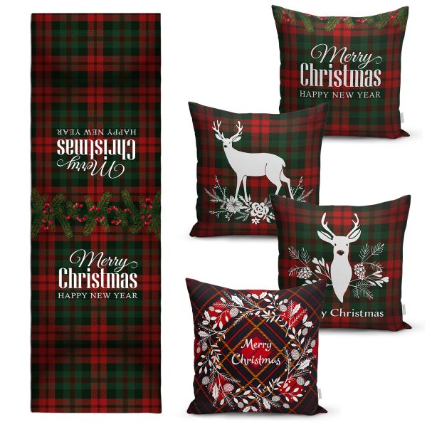 4+1 Kırmızı Ekose Mery Christmas Özel Tasarımlı Amerikan Servis & Runner Seti