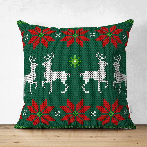 Çift Taraflı Yeşil Zeminde Yılbaşı Geyikleri Desenli Dekoratif Süet Yastık Kırlent Kılıfı