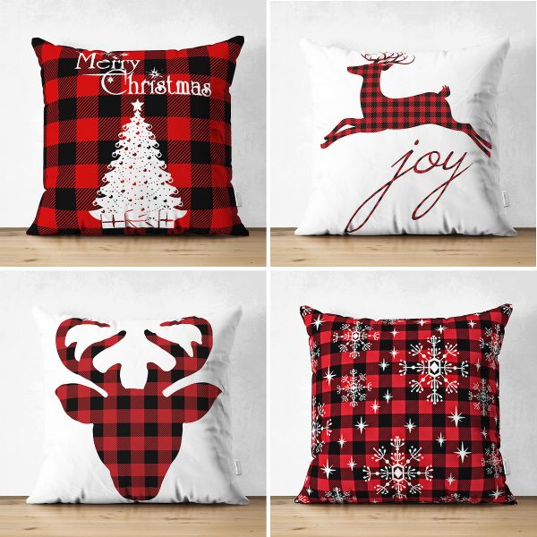 Realhomes Çift Taraflı Ekose Zeminli Yılbaşı Desenli 4’lü Süet Yastık Kırlent Kılıf Seti