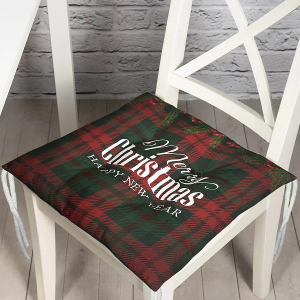 Ekose Zeminde Merry Christmas Baskılı Dekoratif Pofuduk Sandalye Minderi