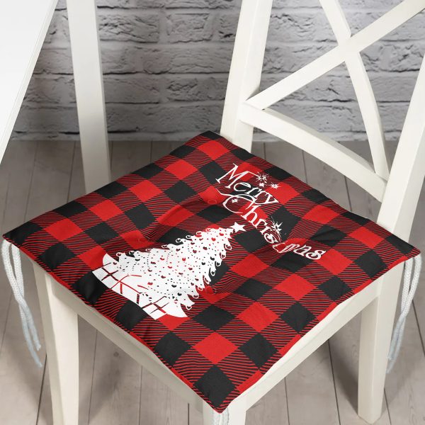 Siyah Kırmızı Ekose Desenli Yılbaşı Temalı Dekoratif Pofuduk Sandalye Minderi