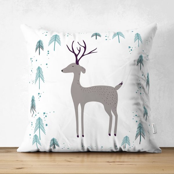Ekose Zemin Geyik Tasarımlı Dijital Baskılı Dekoratif Yastık Kırlent Kılıfı