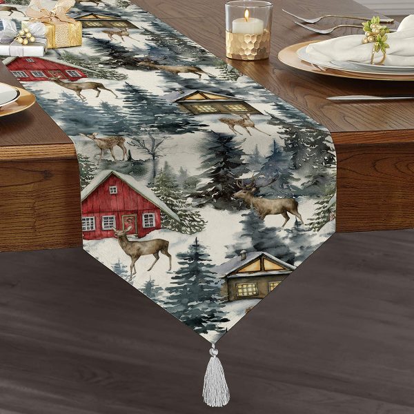 Ekose Zemin Geyik Tasarımlı Dijital Baskılı Dekoratif Püsküllü Şönil Üçgen Runner