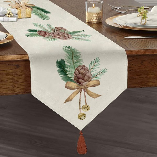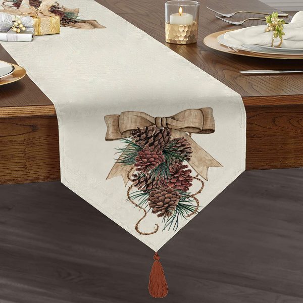 Kozalak Çizimli Cristmas Temalı Dijital Baskılı Dekoratif Püsküllü Şönil Üçgen Runner