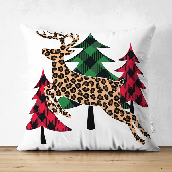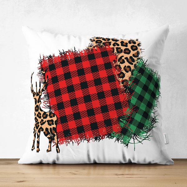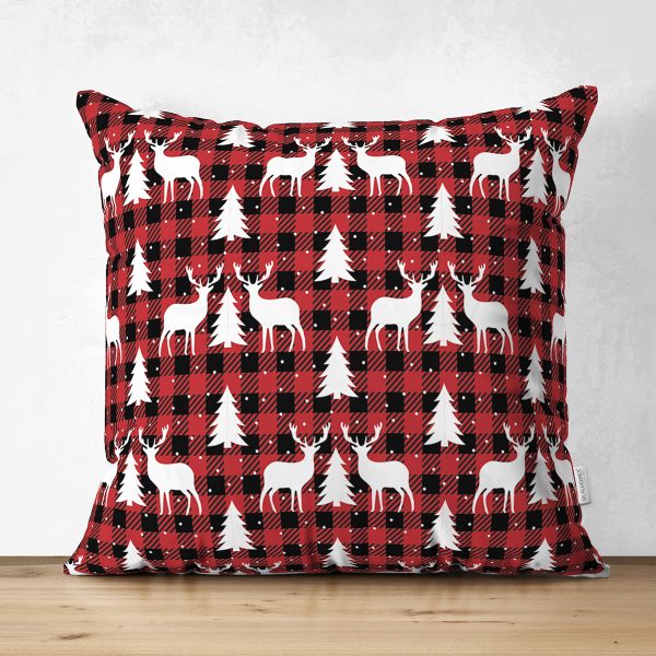 Çift Taraflı Kırmızı Ekose Desenli Geyik Motifli Dijital Baskılı Modern Süet Yastık Kırlent Kılıfı