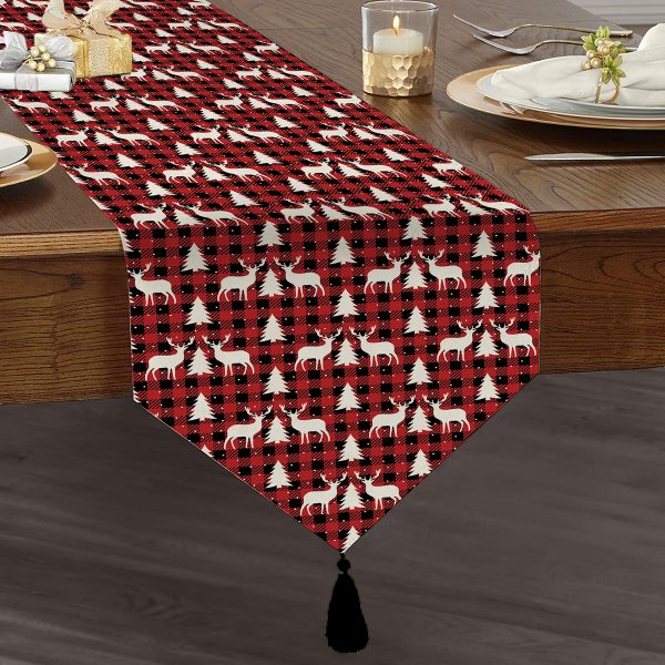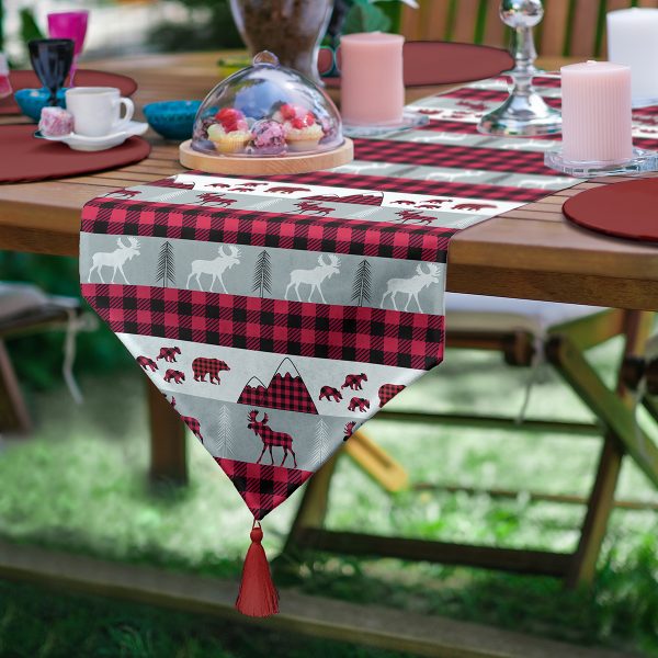Realhomes Kırmızı Ekose Desenli Geyik Motifli Dijital Baskılı Özel Tasarım Püsküllü Şönil Üçgen Runner