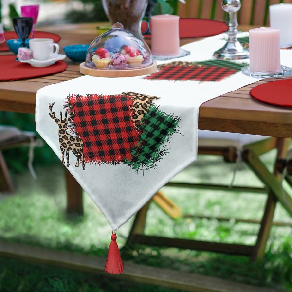 Realhomes Beyaz Zemin Üzerinde Ekose Desenli Geyik Desenli Dijital Baskılı Özel Tasarım Püsküllü Şönil Üçgen Runner