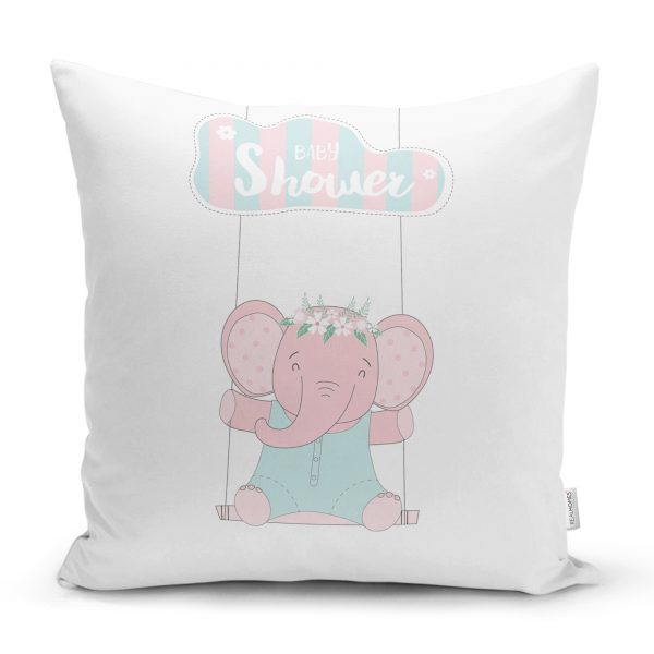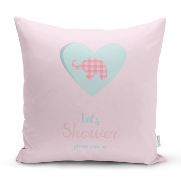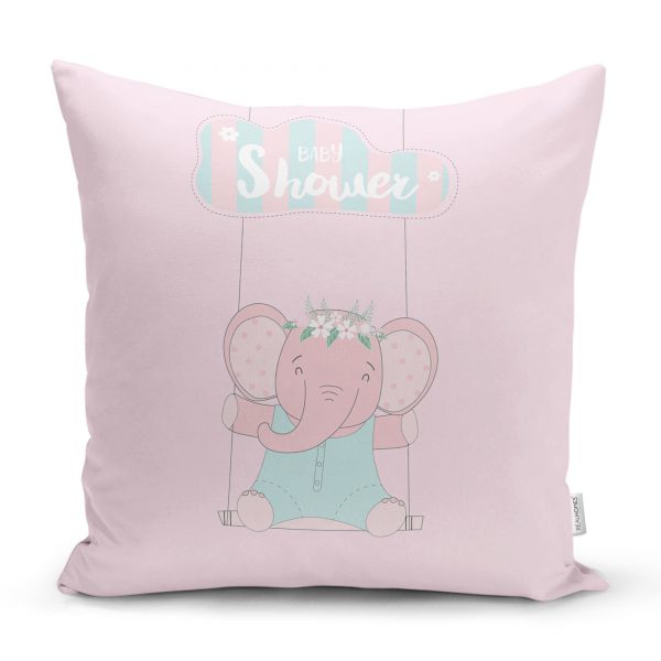 Pembe Zeminli Lets Shower Fil Desenli Bebek Odası Yastık Kılıfı