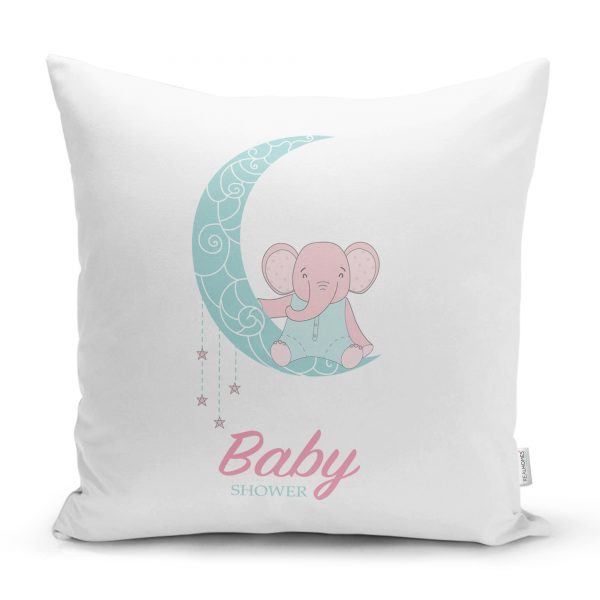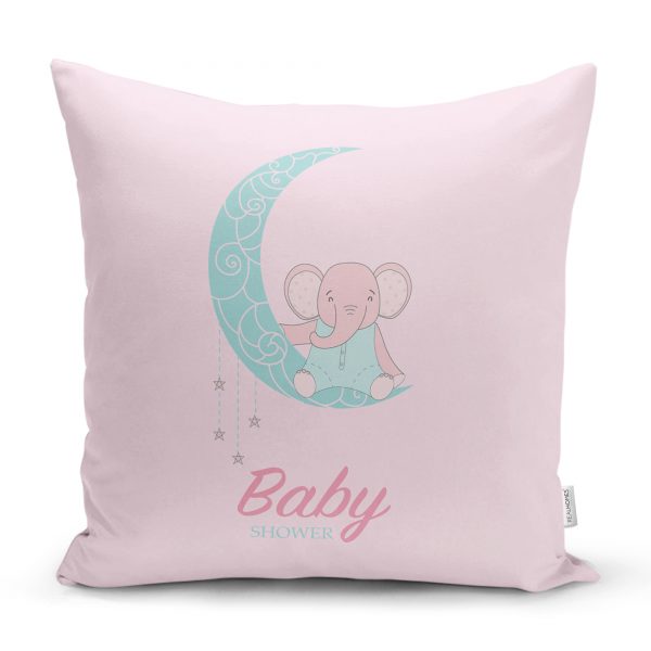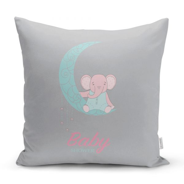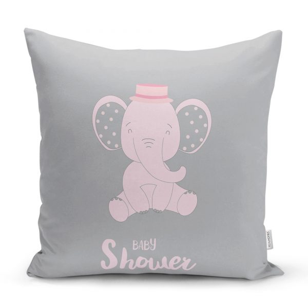 Gri Zeminde Pembe Fil Desenli Baby Shower Bebek Odası Yastık Kılıfı