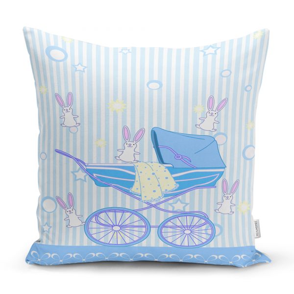 Mavi Çizgili Bebek Arabası Motifli Bebek Odası Yastık Kılıfı