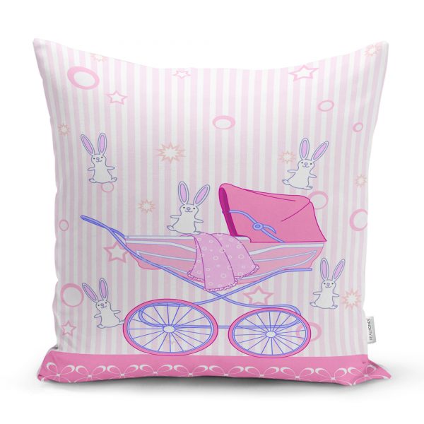 Pembe Çizgili Bebek Arabası Motifli Bebek Odası Yastık Kılıfı