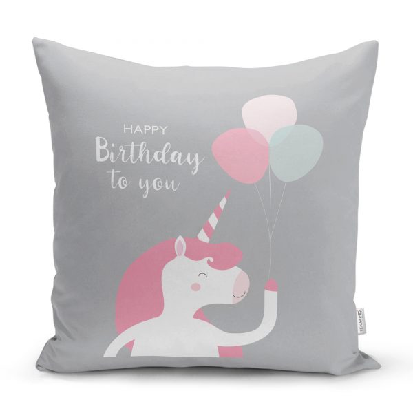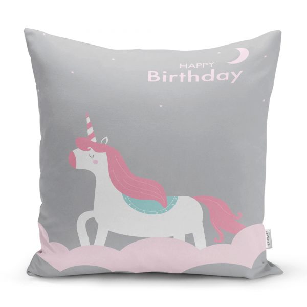 Gri Zeminli Happy Birthday Unicorn Desenli Bebek Odası Yastık Kılıfı