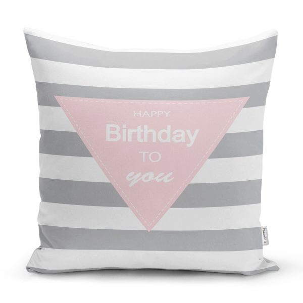Gri Beyaz Çizgili Happy Birthday Tasarımlı Bebek Odası Yastık Kılıfı
