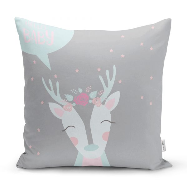 Gri Zeminde Sevimli Geyik Tasarımlı Çocuk Odası Yastık Kılıfı