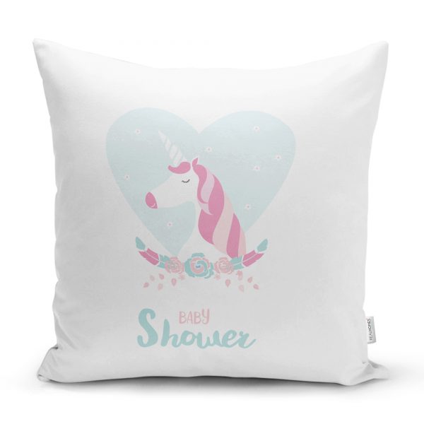 Beyaz Zeminli Unicorn Baby Shower Desenli Çocuk Odası Yastık Kılıfı