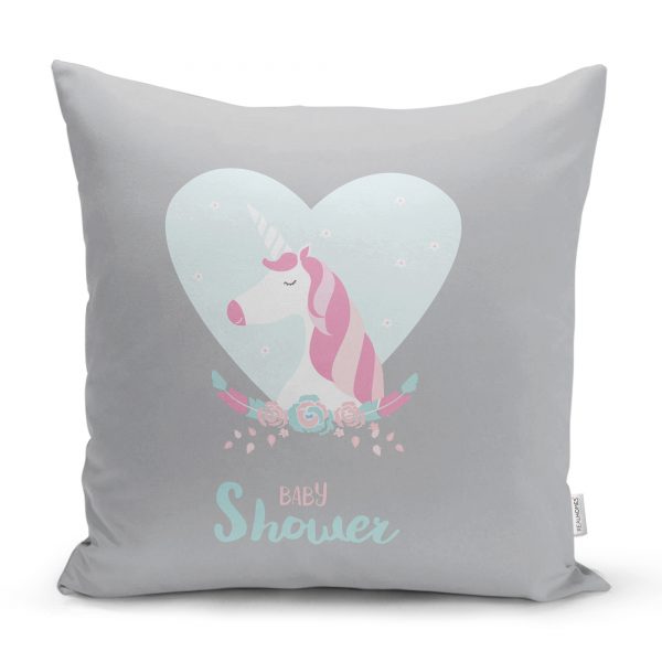 Gri Zeminli Unicorn Baby Shower Desenli Çocuk Odası Yastık Kılıfı