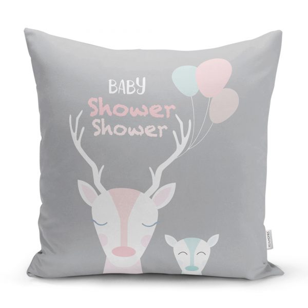 Gri Zeminde Sevimli Geyik Tasarımlı Bebek Odası Yastık Kılıfı