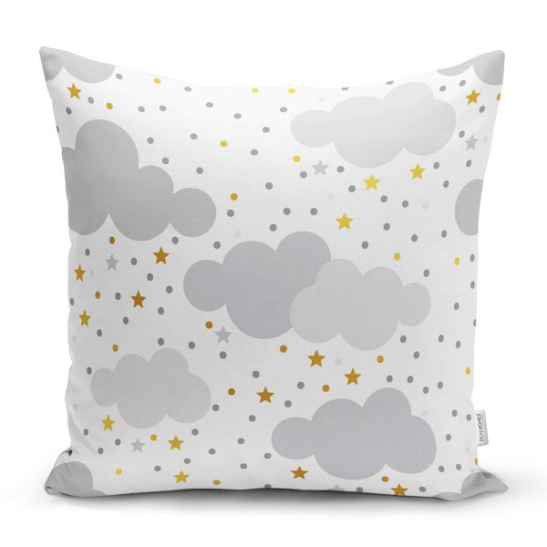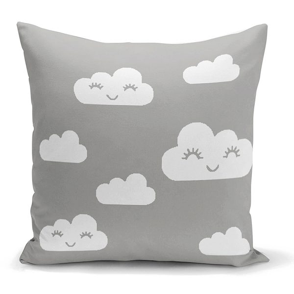 Gri Zeminli Bulut Motifli Dijital Baskılı Dekoratif Kırlent Kılıfı