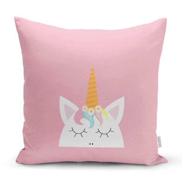 Pembe Zeminde Unicorn Desenli Çocuk Odası Yastık Kırlent Kılıfı
