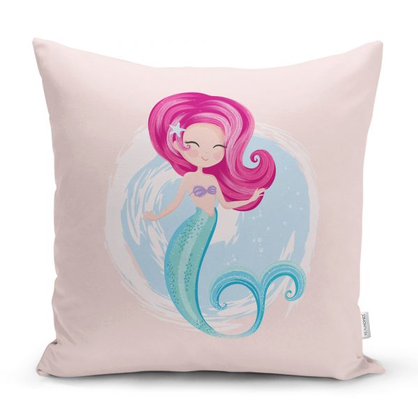 Pembe Zeminde Denizkızı Desenli Dijital Baskılı Çocuk Odası Yastık Kırlent Kılıfı