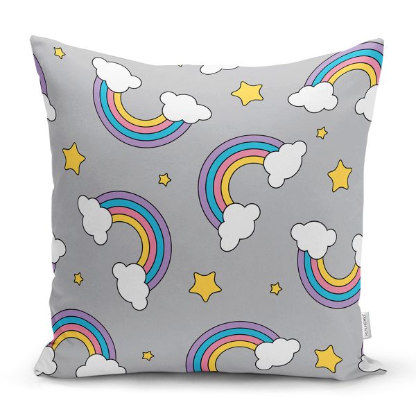 Realhomes Gri Zeminde Unicorn Gökkuşağı Dijital Baskılı Modern Kırlent Kılıfı