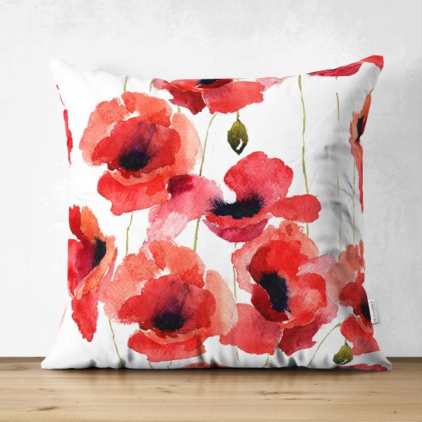 Kırmızı Çiçekli Çift Taraflı Dijital Baskılı Dekoratif Süet Kırlent Kılıfı
