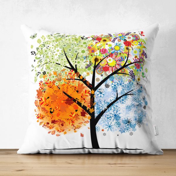 4 Mevsim Ağaç Resimli Çift Taraflı Dekoratif Süet Yastık Kırlent Kılıfı
