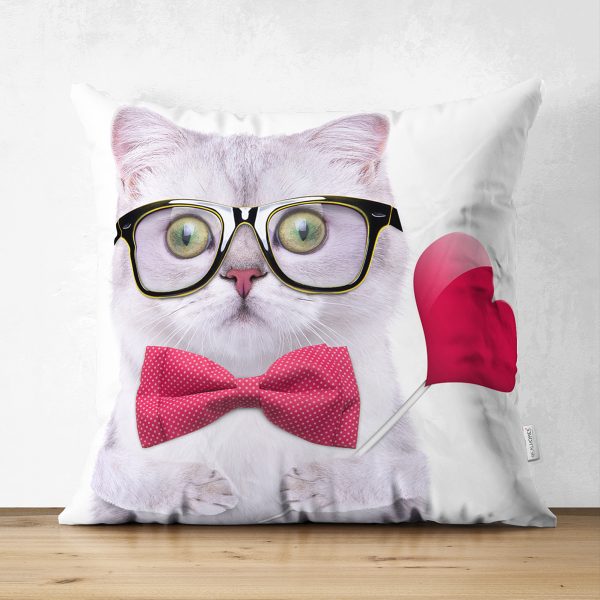 Kedili Çift Taraflı Dijital Baskılı Dekoratif Süet Yastık Kırlent Kılıfı