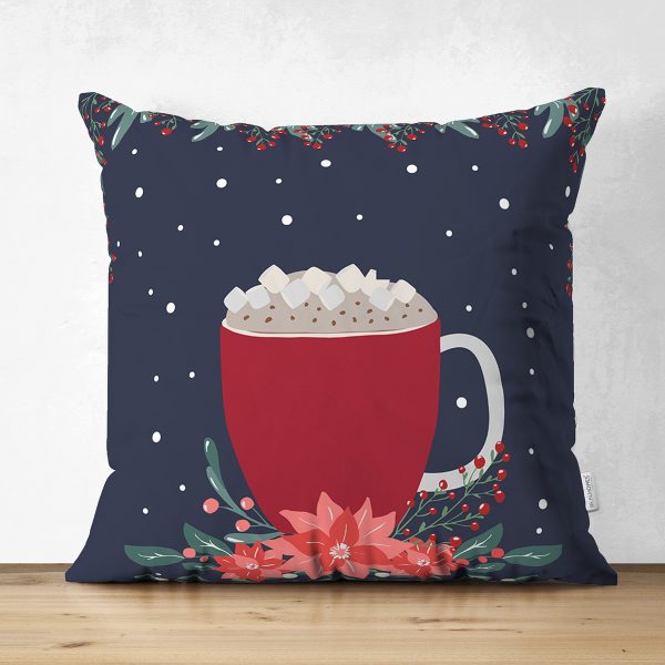 Çift Taraflı Lacivert Zemin Kırmızı Bardak Desenli Dijital Baskılı Modern Süet Yastık Kırlent Kılıfı
