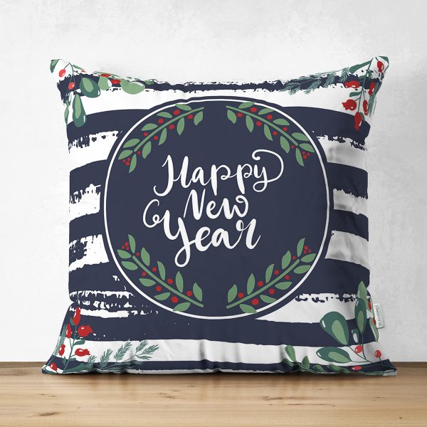 Çift Taraflı Lacivert Çizgili Happy New Year Motifli Dijital Baskılı Modern Süet Yastık Kırlent Kılıfı