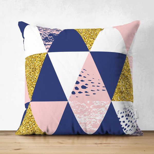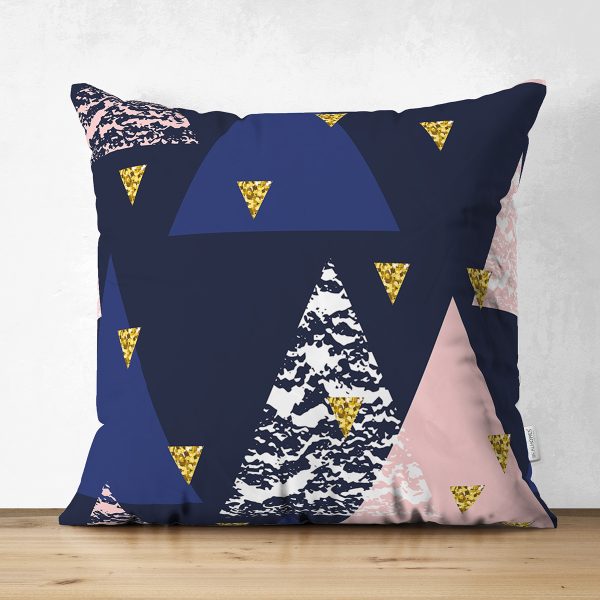 Çift Taraflı Lacivert Zemin Geometrik Üçgen Tasarımlı Dijital Baskılı Dekoratif Süet Yastık Kırlent Kılıfı