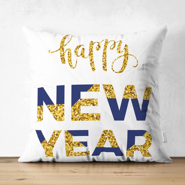 Çift Taraflı Beyaz Zemin Gold & Lacivert Happy New Year Çizimli Dijital Baskılı Modern Süet Yastık Kırlent Kılıfı