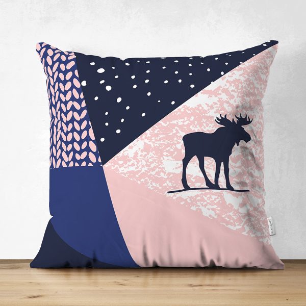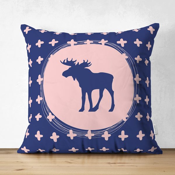 Çift Taraflı Lacivert Zemin Geyik Tasarımlı Dijital Baskılı Dekoratif Süet Yastık Kırlent Kılıfı