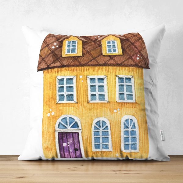 Çift Taraflı Minyatür Sarı Ev Çizimli Dijital Baskılı Dekoratif Süet Yastık Kırlent Kılıfı