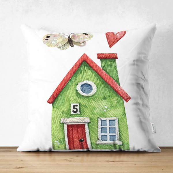 Çift Taraflı Minyatür Yeşil Ev Çizimli Dijital Baskılı Modern Süet Yastık Kırlent Kılıfı