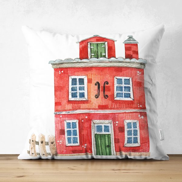 Çift Taraflı Minyatür Kırmızı Ev Çizimli Dijital Baskılı Dekoratif Süet Yastık Kırlent Kılıfı