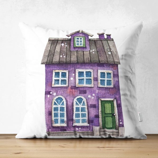 Çift Taraflı Minyatür Mor Ev Çizimli Dijital Baskılı Modern Süet Yastık Kırlent Kılıfı