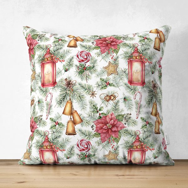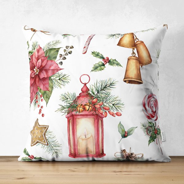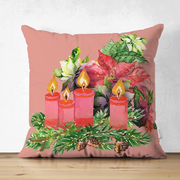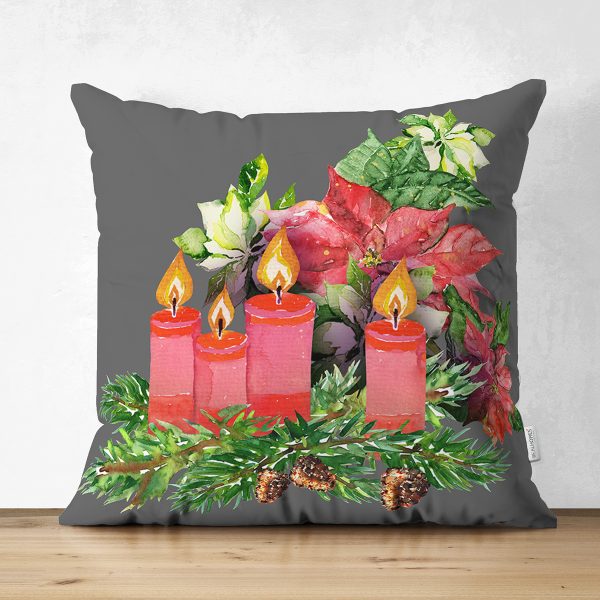 Çift Taraflı Şamdan Tasarımlı Yılbaşı Konseptli Dijital Baskılı Dekoratif Süet Yastık Kırlent Kılıfı