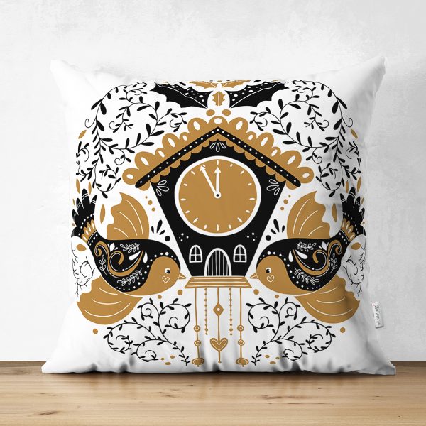 Çift Taraflı Çini Çizimli Guguklu Saat Motifli Dijital Baskılı Dekoratif Süet Yastık Kırlent Kılıfı