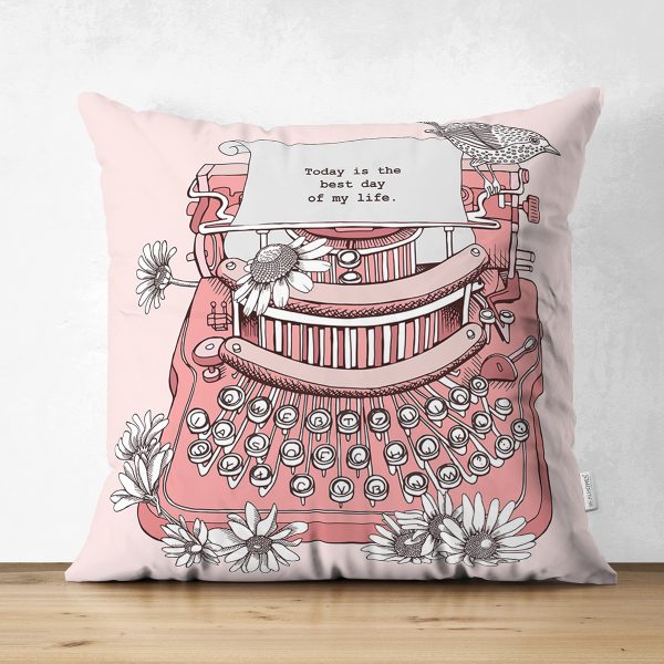 Çift Taraflı Pembe Zemin Daktilo Tasarımlı Dijital Baskılı Modern Süet Yastık Kırlent Kılıfı