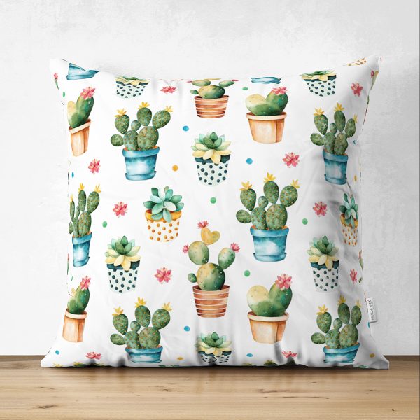 Çift Taraflı Saksıda Sevimli Kaktüsler Tasarımlı Dekoratif Modern Süet Yastık Kırlent Kılıfı