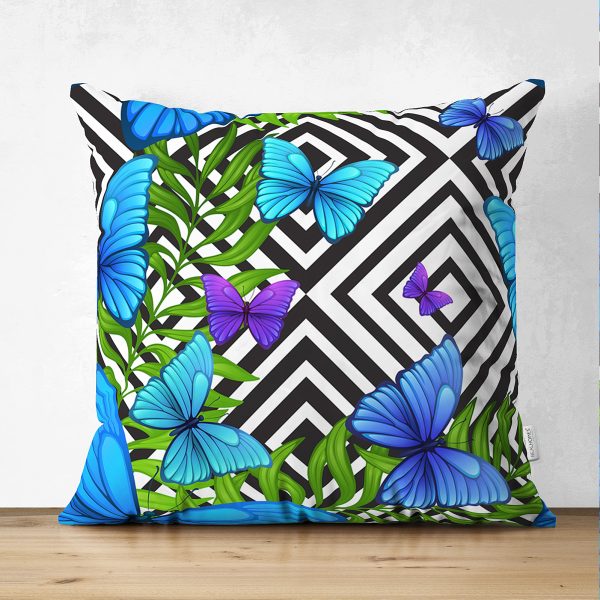 Çift Taraflı Geometrik Zeminli Mavi Kelebek Dijital Baskılı Süet Yastık Kırlent Kılıfı