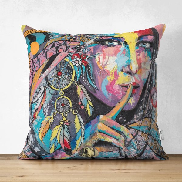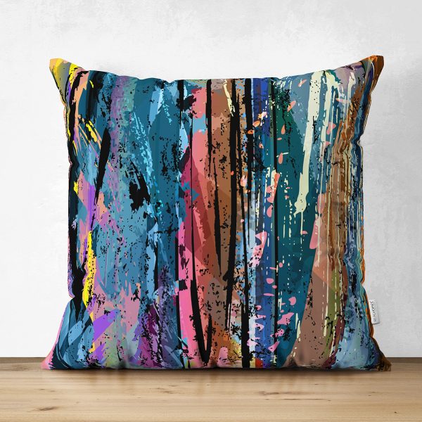 Sulu Boya Tüy Motifli Renkli Kadın Çift Taraflı Özel Tasarım Süet Kırlent Kılıfı