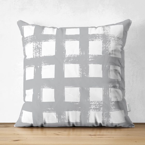 Gri Zeminde Geometrik Kare Motifli Çift Taraflı Dekoratif Süet Yastık Kılıfı